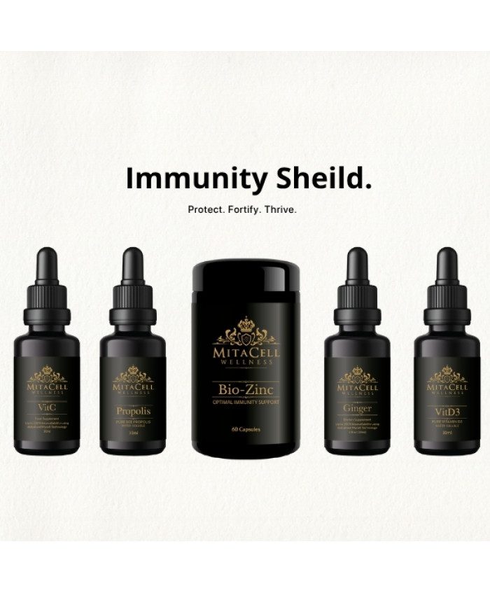 IMMUNE SHIELD STACKWhat It IsThe Immune Shield Stack combines five powerhouse Mitacell formulas — Vitamin C, Propolis, Vitamin D3, Bio-Zinc, and Ginger — to provide daily immune defence, antioxidant protection, and resilience against stressors. Together, they form a complete shield to keep your body strong year-round.How It WorksVitamin C supports immune cell activity, collagen production, and antioxidant defence.Propolis provides natural antimicrobial and antiviral protection while strengthening immune response.Vitamin D3 regulates immune balance and helps the body fight infections.Bio-Zinc supports immune system function, hormone balance, and cellular repair.Ginger contributes anti-inflammatory and antioxidant activity, aiding digestion and circulation.BenefitsStrengthens the immune system and natural defences.Protects against oxidative stress and free radical damage.Reduces inflammation and supports recovery.Contributes to energy, vitality, and resilience.Promotes overall wellbeing during seasonal or environmental challenges.Who It’s ForAdults wanting daily immune protection and resilience.Individuals prone to colds, flu, or low immunity.Anyone under stress, fatigue, or frequent exposure to pathogens.When to TakeDaily, especially during winter, periods of stress, or travel.How to TakeVitamin C (MyCell): 5–10 drops daily under the tongue.Propolis (MyCell): 5–10 drops daily under the tongue.Vitamin D3 (MyCell): 5–10 drops daily under the tongue.Bio-Zinc (Capsules): 1–2 capsules daily with food.Ginger (MyCell): 5–10 drops daily under the tongue.Mitacell Quality NoteAll ingredients delivered in advanced MyCell or capsule technology for superior absorption.Vegan, allergen-free, and preservative-free.Packaged in Miron VioletGlass to protect freshness and potency.Did You Know around 70% of the immune system is housed in the gut. Combining immune boosters like Vitamin C and Propolis with Ginger not only strengthens immunity but also supports digestion, which is the foundation of overall resilience...