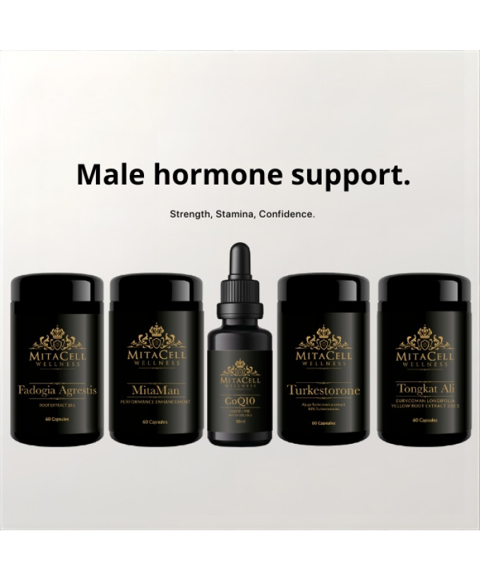 MALE VITALITY & HORMONE SUPPORT STACKWhat It IsThe Male Vitality & Hormone Support Stack combines MitaMan, Tongkat Ali, Fadogia Agrestis, Turkesterone, and CoQ10 to optimise male hormones, enhance energy, and improve performance. This stack is designed for men who want to feel strong, energised, and resilient — both in daily life and during training.How It WorksMitaMan delivers a 7-in-1 male vitality complex for overall hormone and energy support.Tongkat Ali naturally boosts testosterone levels and enhances stress resilience.Fadogia Agrestis supports libido, stamina, and reproductive health.Turkesterone promotes lean muscle growth, strength, and faster recovery.CoQ10 powers mitochondria, improving cellular energy, cardiovascular health, and endurance.BenefitsSupports natural testosterone and hormone balance.Boosts stamina, energy, and libido.Promotes lean muscle mass and athletic recovery.Enhances cardiovascular and cellular vitality.Contributes to long-term male resilience and performance.Who It’s ForMen seeking natural hormone and vitality support.Athletes and gym users wanting enhanced performance and recovery.Men experiencing stress, fatigue, or age-related energy decline.When to TakeDaily, ideally in the morning and around training sessions.How to TakeMitaMan: 2 capsules daily.Tongkat Ali: 2 capsules daily.Fadogia Agrestis: 2 capsules daily (cycle 1 month on, 1 month off).Turkesterone: 1–2 capsules daily.CoQ10 (MyCell): 5–10 drops daily under the tongue, preferably in the morning.Mitacell Quality NoteCombines high-potency herbal extracts with advanced MyCell CoQ10 for superior absorption and effectiveness. Vegan, allergen-free, and preservative-free.Did You Know?CoQ10 levels naturally decline with age and stress, reducing energy and stamina. Combining CoQ10 with Tongkat Ali, Fadogia, and Turkesterone helps maintain peak male performance and resilience...