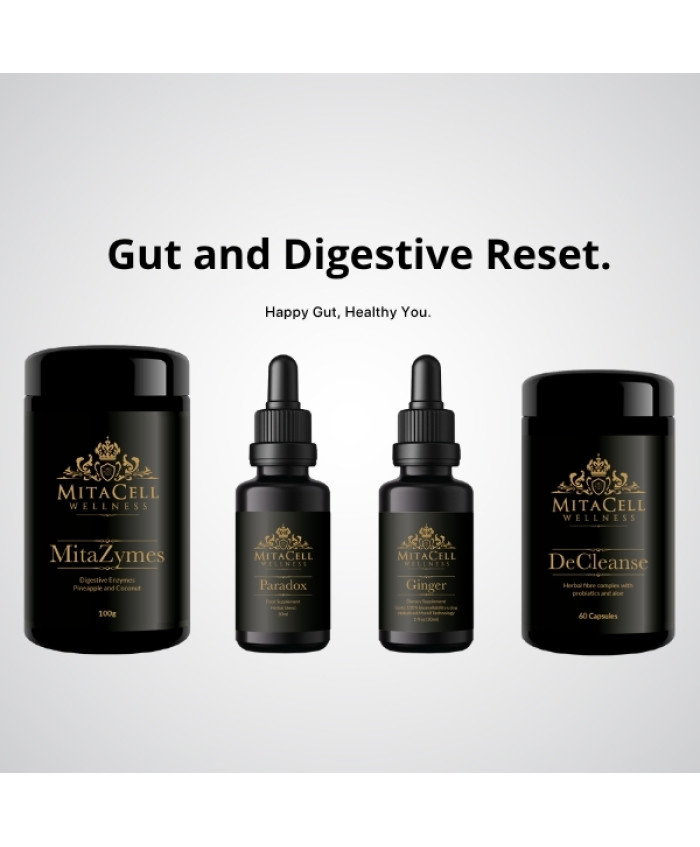 GUT & DIGESTIVE RESET STACKWhat It IsThis stack combines Declense, MitaZymes, Paradox, and Ginger to cleanse, restore, and rebalance digestion. It supports detox, nutrient absorption, and long-term gut health.How It WorksDeclense gently cleanses the digestive system and supports elimination.MitaZymes provide digestive enzymes for efficient nutrient breakdown.Paradox helps clear parasites and unwanted organisms.Ginger reduces bloating, inflammation, and supports circulation.BenefitsPromotes healthy digestion and nutrient absorption.Reduces bloating and discomfort.Supports natural detox pathways.Strengthens immunity through gut balance.Who It’s ForAdults with digestive discomfort or sluggishness.Individuals seeking detox or gut reset.Anyone wanting to optimise nutrient uptake.When to TakeDaily, during a cleanse or ongoing digestive support.How to TakeDeclense: 2 capsules daily.MitaZymes: 1 scoop (5 g) with meals.Paradox: 0.5 ml daily (½ dropper).Ginger: 5–10 drops daily.Mitacell Quality NoteAll formulas are vegan and preservative-free, designed to work synergistically.Did You Know?Up to 70% of the immune system is housed in the gut — making digestive health key to overall wellbeing...